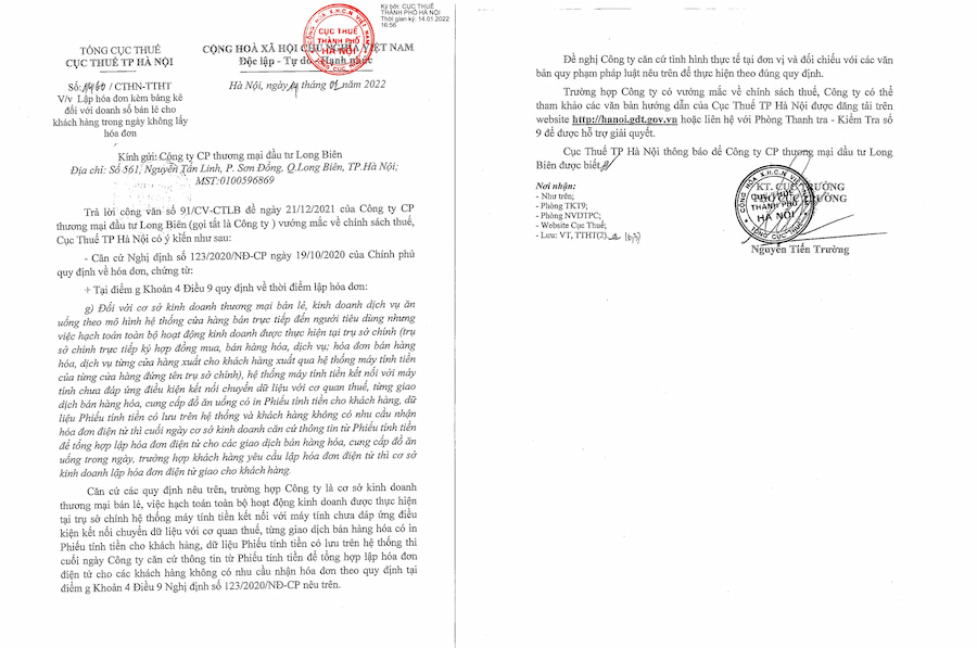 Cụ thể, theo quy định tại Điều 9 Nghị định 123/2020/NĐ-CP, nếu cơ sở kinh doanh bán lẻ tại trụ sở chính sử dụng hệ thống máy tính tiền nhưng chưa đảm bảo kết nối và truyền dữ liệu đến cơ quan thuế, thì mỗi giao dịch sẽ được in phiếu tính tiền và dữ liệu sẽ được lưu trữ trên hệ thống. Cuối ngày, doanh nghiệp sẽ căn cứ vào dữ liệu này để lập hóa đơn điện tử tổng hợp cho các giao dịch mà khách hàng không lấy hóa đơn.
