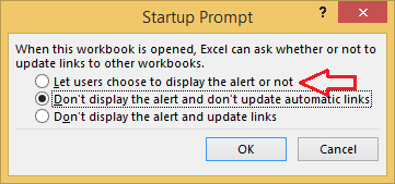Lúc này, hộp thoại Startup Prompt hiện ra. Các bạn nhấn chọn mục Don’t display the alert and don’t update automatic links để không hiển thị lại thông báo Update link khi xử lý tài liệu Excel sau này. Cuối cùng các bạn nhấn OK để hoàn tất.