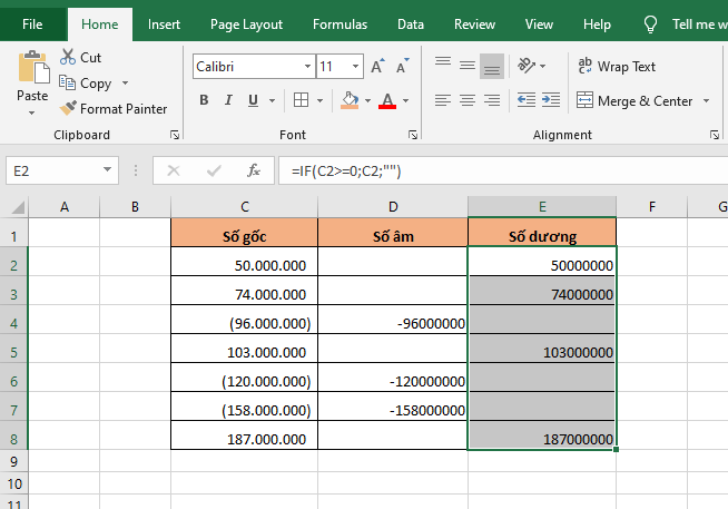 Bước 1: Tách các số âm: nhập công thức hàm IF tại ô E2: =IF(D2<0;D2;””)