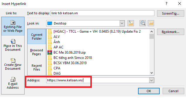 Cửa sổ Insert Hyperlink hiện ra, khi này các bạn giữ nguyên ở mục Existing File or Web Page.