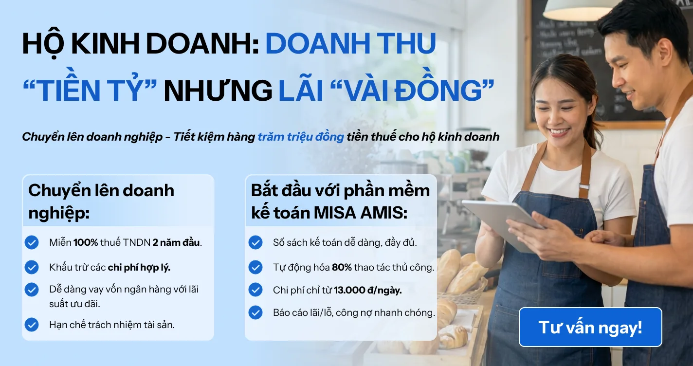 Khi hộ kinh doanh đã mở rộng quy mô, phát sinh nhiều giao dịch, cần minh bạch tài chính và tách bạch trách nhiệm, việc chuyển lên doanh nghiệp là bước đi tất yếu. Ở giai đoạn này, doanh nghiệp cần một công cụ giúp chuẩn hóa sổ sách ngay từ đầu, theo dõi doanh thu – chi phí, quản lý hóa đơn và lập báo cáo tài chính đúng quy định. Phần mềm AMIS Kế toán là giải pháp phù hợp cho doanh nghiệp mới chuyển đổi, hỗ trợ quản lý kế toán tập trung, hạn chế sai sót và giúp doanh nghiệp vận hành ổn định, tuân thủ pháp luật ngay từ những năm đầu hoạt động.