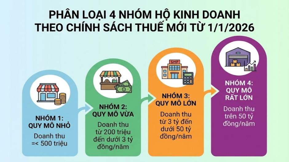 Từ kỳ tính thuế 2026, theo Quyết định 3389/QĐ-BTC và Luật Quản lý thuế sửa đổi, hộ kinh doanh sẽ không còn áp dụng thuế khoán mà được quản lý theo 4 nhóm doanh thu. Việc phân loại này giúp áp dụng mức thuế, phương pháp kê khai, chế độ kế toán và hóa đơn phù hợp với từng quy mô kinh doanh.