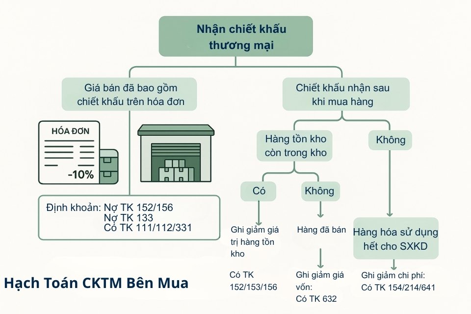 Trong trường hợp các khoản chiết khấu thương mại nhận được sau khi mua hàng, kế toán phải căn cứ vào tình hình biến động của hàng tồn kho để phân bổ