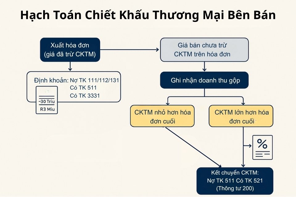 - Theo thông tư 200/2014/TT-BTC: Sử dụng tài khoản 5211 (chiết khấu thương mại) để phản ánh CKTM cho người mua khi mua số lượng lớn nhưng chưa phản ánh trên hóa đơn khi bán trong kỳ. Cuối kỳ, kế toán kết chuyển số CKTM sang tài khoản 511 (doanh thu bán hàng và cung cấp dịch vụ) để giảm doanh thu thuần.