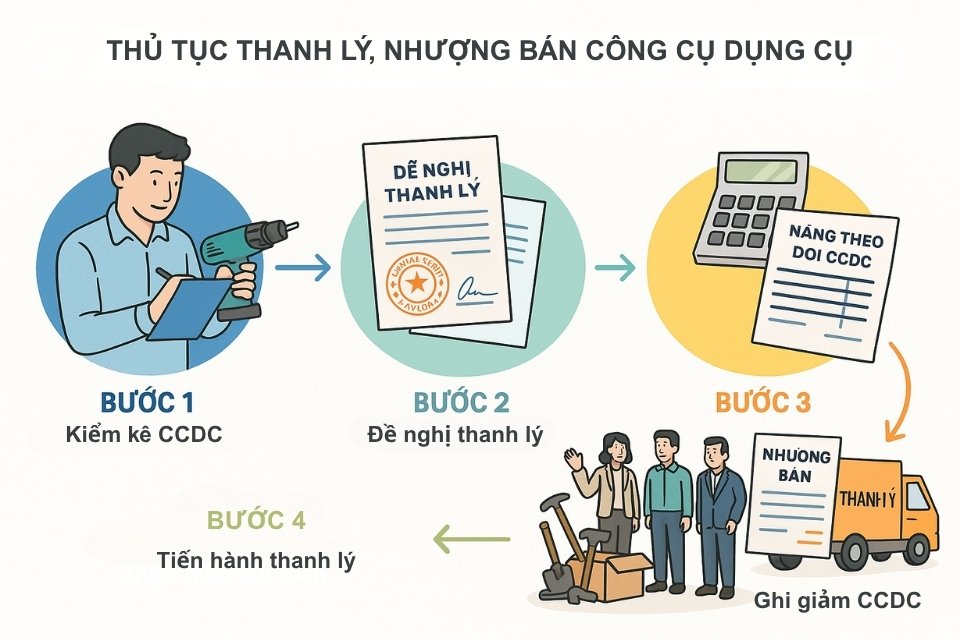 Quy trình thanh lý, nhượng bán công cụ dụng cụ gồm các bước sau: