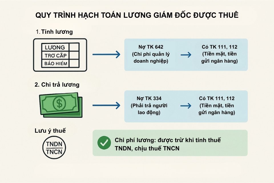 - Nếu là giám đốc thuê về thì tiền lương và các phụ phí liên quan đều được hạch toán như lương nhân viên bình thường và tính vào chi phí quản lý doanh nghiệp, vẫn được khấu trừ khi tính thuế TNDN và phải chịu thuế TNCN.