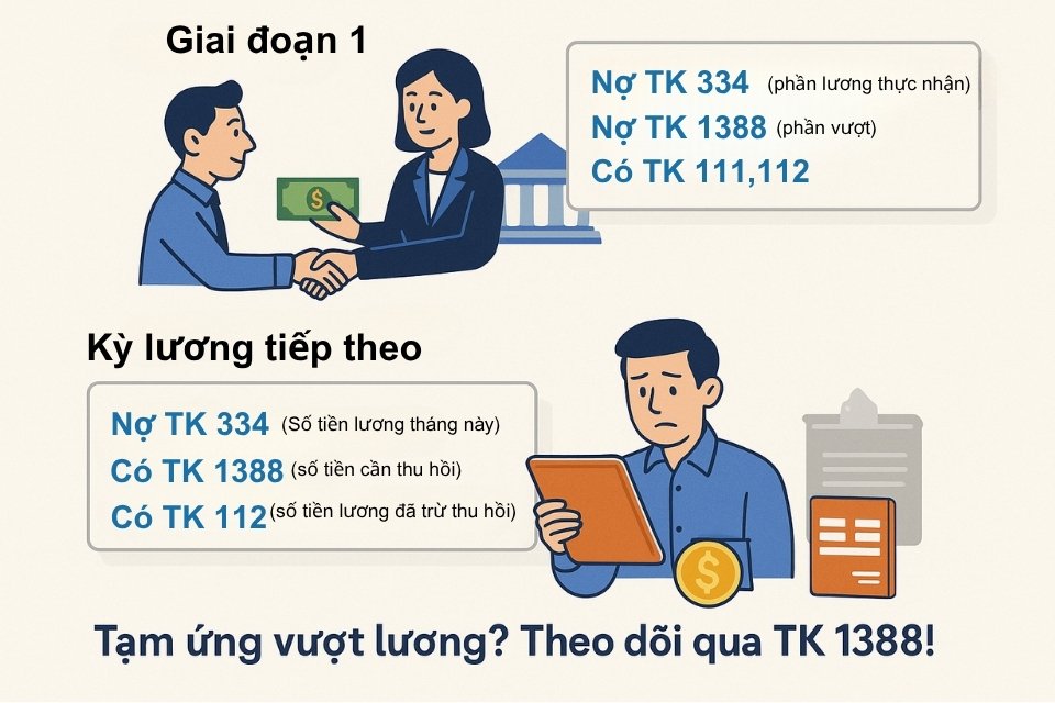 Nếu phần tạm ứng lương vượt quá số lương thực nhận của nhân viên. Ghi phần chi vượt qua vào tài khoản 1388 (phải thu khác) để theo dõi và thu hồi trong các kỳ tiếp theo.