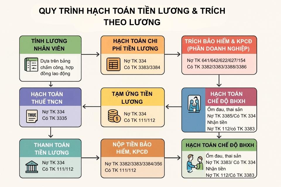 Các nghiệp vụ hạch toán tiền lương và các khoản trích theo lương thường được thực hiện theo các bước sau: