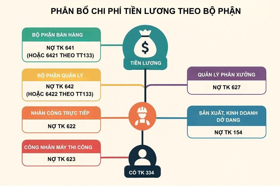 Căn cứ vào bảng tính lương, phiếu tính lương để hạch toán chi phí tiền lương cho từng bộ phận mà người lao động đang làm việc: