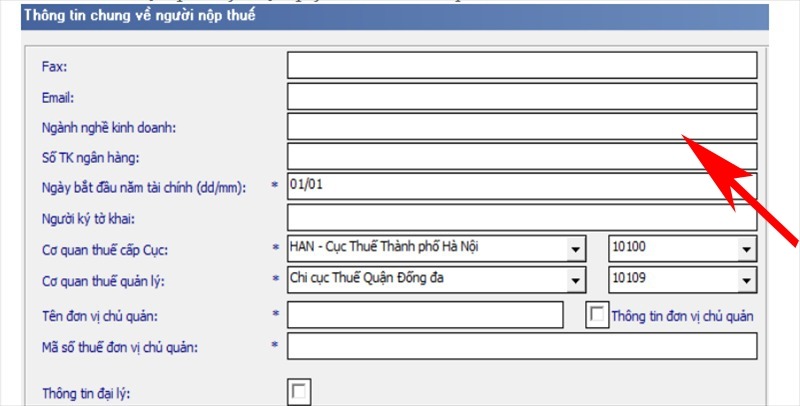 Bước 2: Nếu là lần khai báo mã số thuế đầu tiên thì hệ thống sẽ hiển thị ngay màn hình để khai báo thông tin về doanh nghiệp. Lưu ý điền các thông tin bắt buộc có dấu (*).