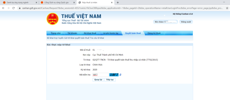 Tải chứng từ khấu trừ thuế, chứng từ nộp thuế… → Nhập mã kiểm tra → Nhập OTP gửi về điện thoại và chờ hệ thống báo “Nộp tờ khai thành công”