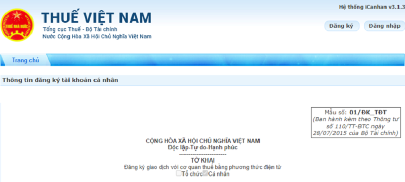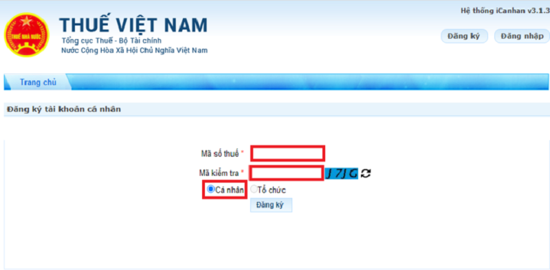 Bước 2: Nhập đầy đủ thông tin gồm mã số thuế và mã kiểm tra, chọn mục “Cá nhân”, rồi nhấn “Đăng ký”.