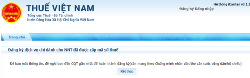 - Nếu chưa có mã xác nhận: hệ thống hiển thị thông báo: “Để bảo mật thông tin, đề nghị bạn đến cơ quan thuế gần nhất để hoàn tất đăng ký (mang theo CMND/CCCD hoặc hộ chiếu).”