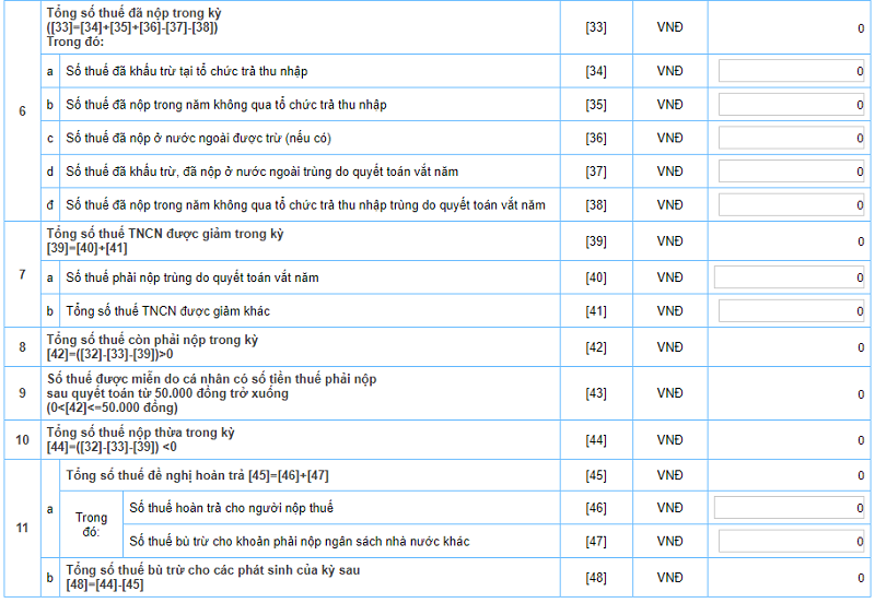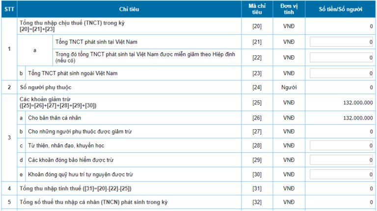 | [23]: | Tổng TNCT phát sinh ngoài Việt Nam: Là tổng các khoản thu nhập chịu thuế từ tiền lương; tiền công và các khoản thu nhập chịu thuế khác; có tính chất tiền lương tiền công phát sinh ngoài Việt Nam (Không có thì không điền). |