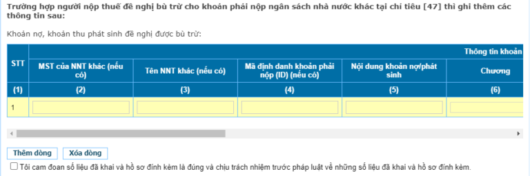 Trường hợp đề nghị bù trừ thuế: Nếu muốn bù trừ số thuế nộp thừa với khoản phải nộp khác, điền thông tin tại chỉ tiêu [47], gồm: