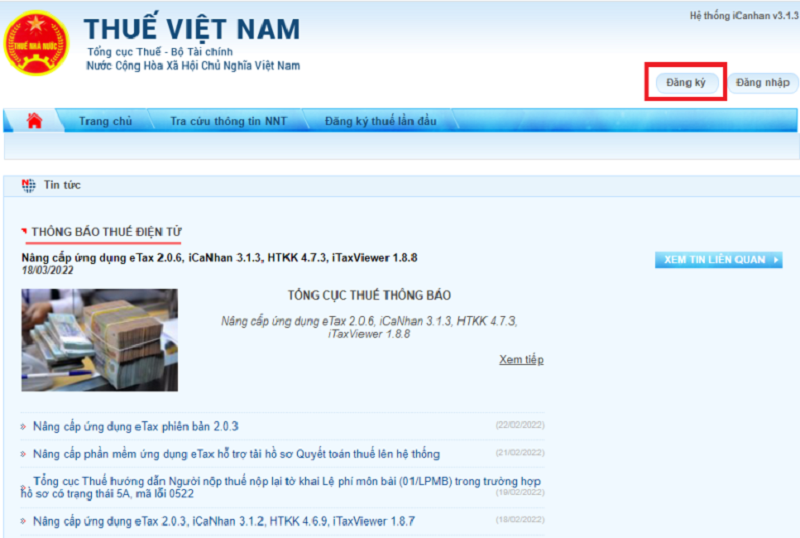 Bước 1: Truy cập Cổng thông tin Thuế Việt Nam tại địa chỉ https://canhan.gdt.gov.vn, sau đó chọn “Đăng ký”.