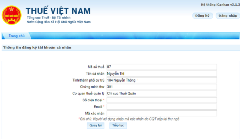 Bước 3: Điền thêm các thông tin cần thiết: số điện thoại, địa chỉ email, và mã xác nhận do cơ quan thuế gửi (nếu đã có). Trường hợp chưa nhận được mã xác nhận, có thể để trống mục này và nhấn “Tiếp tục”.