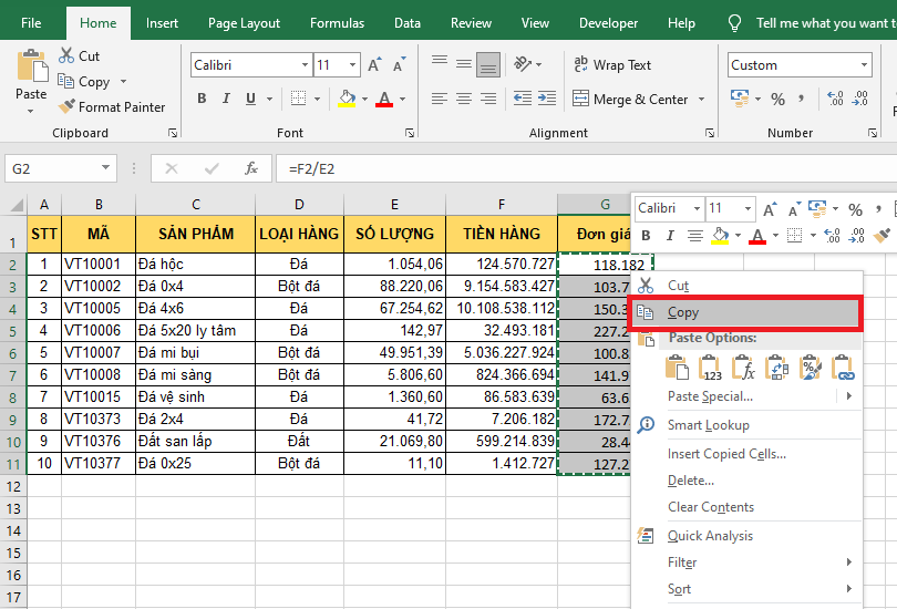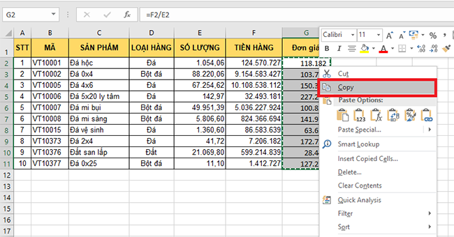 Để sao chép giá trị tại cột đơn giá mà không dính công thức. Bạn chọn vùng dữ liệu (G2:G11) > chuột phải > chọn Copy (hoặc Ctrl + C)