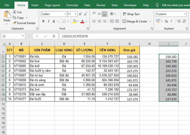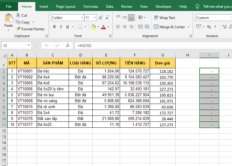 Ví dụ ta có bảng dữ liệu như hình dưới. Cột Đơn giá là hàm thể hiện kết quả của Tiền hàng / Số lượng.