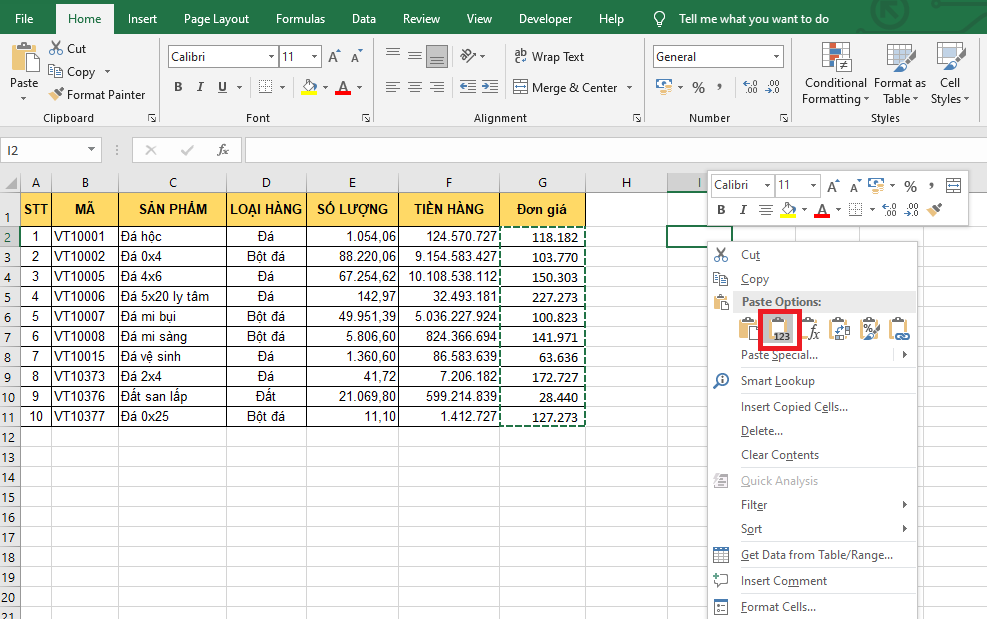 Bước 3: Chọn ô đích bạn muốn giá giá trị ví dụ ô I2. Click chuột phải > chọn vào biểu tượng có số 123 (Values)