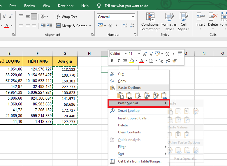 - Mở Paste Special: Nhấp chuột phải vào ô đích và chọn Paste Special