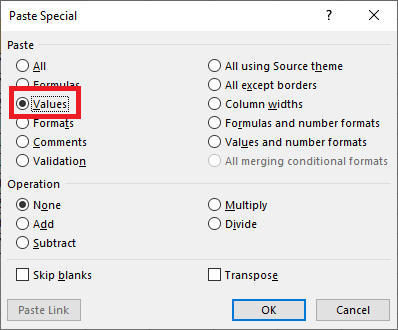 Lúc này, hộp thoại Paste Special hiện ra. Các bạn chọn Values sau đó nhấn OK để hoàn tất. Chỉ cần như vậy là dữ liệu mới đã được chuyển thành giá trị chứ không còn là hàm tính nữa.