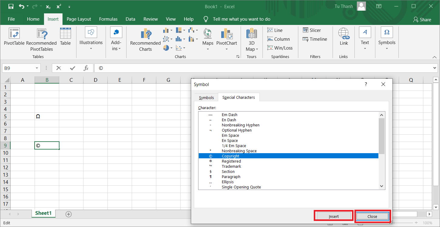 Bước 3: Sau khi tìm được ký hiệu bạn cần thêm vào nội dung file Excel. Các bạn bấm Insert, tiếp sau đó là Close. Các bạn sẽ nhận được kết quả như hình minh họa bên dưới.