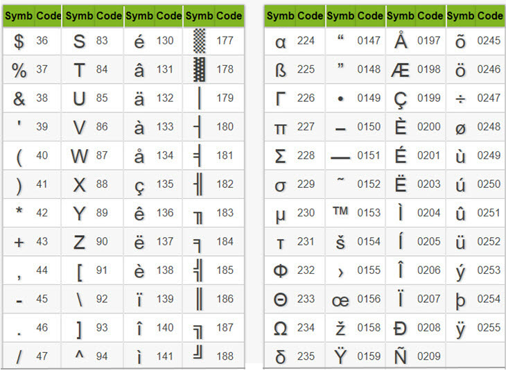 Dưới đây là danh sách Code của các ký hiệu đặc biệt. Các bạn có thể lưu lại hoặc ghi nhớ Code của các ký hiệu thường dùng.