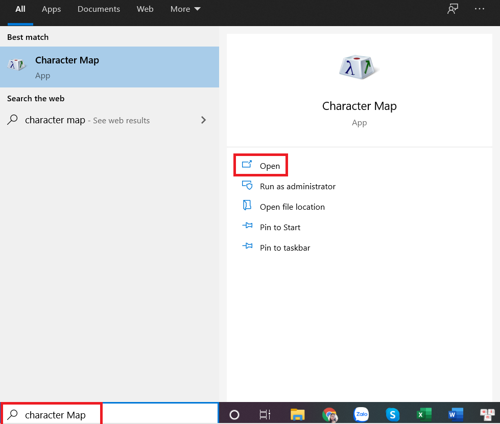 Bước 1: Trên thanh tìm kiếm của Windows, các bạn gõ từ khóa Character Map. Sau đó, các bạn bấm chọn Open.
