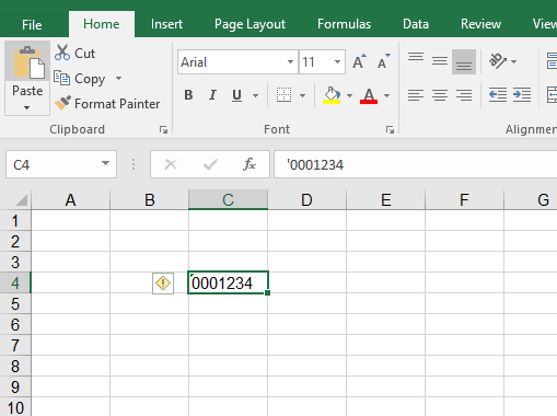 Ví dụ bình thường khi các bạn nhập 0001234 vào ô Excel.