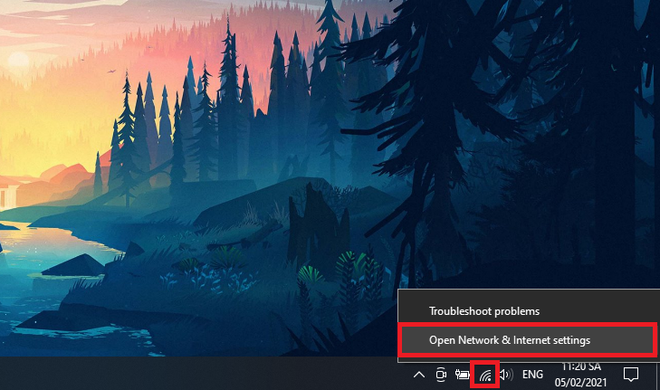 Bước 1: Nhấp chuột phải biểu tượng của Network ở góc bên phải của thanh Taskbar. > Thanh cuộn hiện ra > chọn mục Open Network & Internet settings.