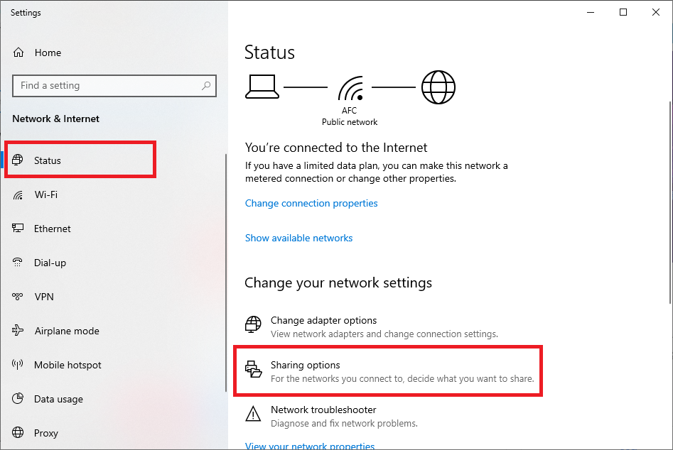 - Bật Files and printer sharing: Open Network & Internet settings > Status > Sharing options > chọn mục Private => Turn on file and printer sharing.