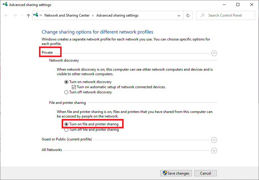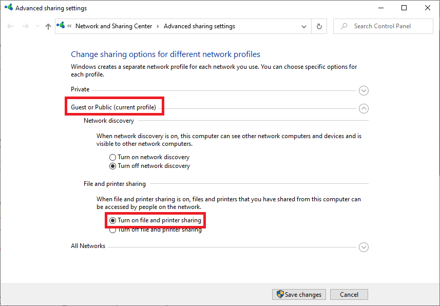 Bước 4: Chọn mục Guest or Public > Turn on file and printer sharing > nhấn Save changes.
