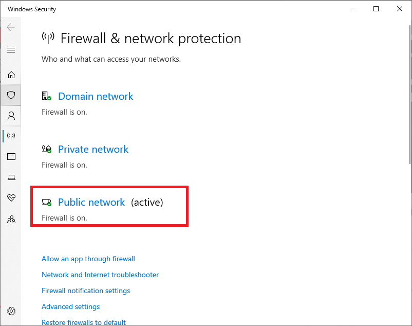 Bước 2: Khi cửa sổ Windows Security xuất hiện > chon mục có chữ Active (ví dụ: Public network).