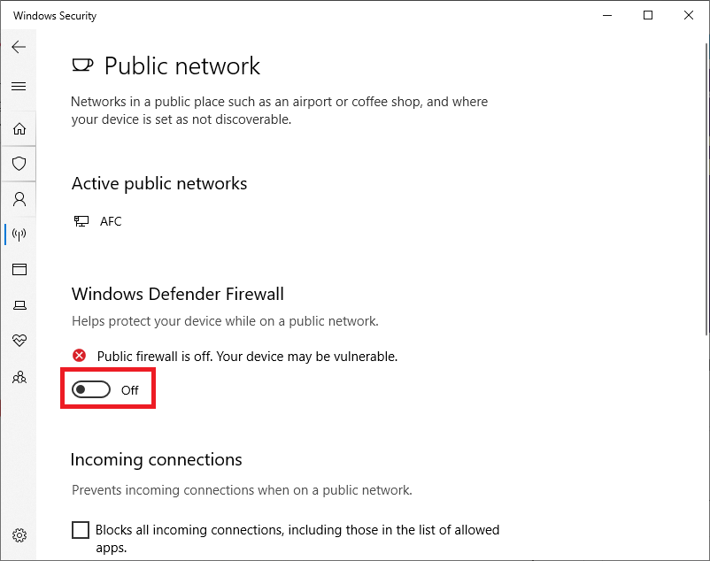 - Tắt Firewall: Mở Firewall & network protection > chọn Public Network > tắt Windows Defender Firewall.
