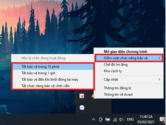 Ta click chuột phải vào biểu tượng của phần mềm diệt virus (ví dụ phần mềm Avast) > chọn Kiểm soát chức năng bảo vệ > Chọn các thời gian tắt bảo vệ như: 10 phút, 1 giờ, đến khi khởi động lại, vĩnh viễn.