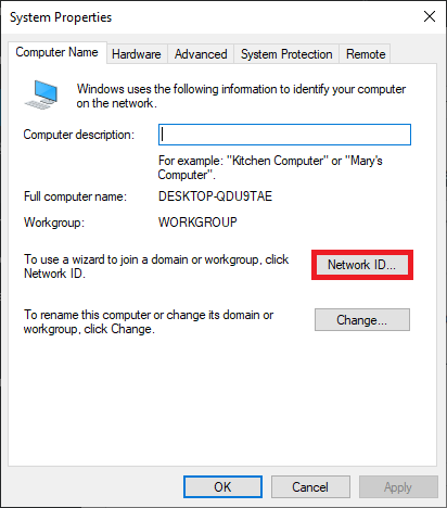 Bước 3: Khi hộp thoại System Properties xuất hiện > chọn mục Network ID…