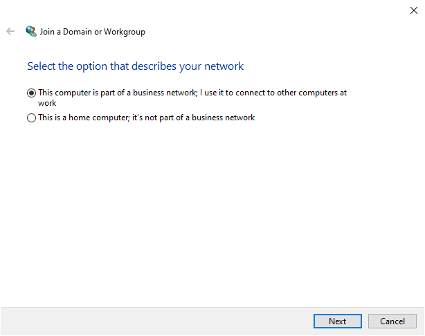 Bước 4: Hộp thoại Join a Domain or Workgroup xuất hiện > Chọn mục This computer is part of a business network; I use it to connect to other computers at work. > sau đó chọn Next để chuyển sang bước tiếp theo.