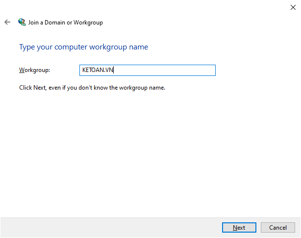 Bước 6: Nhập tên Workgroup > bấm Next để gia nhập.