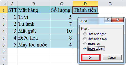 Sau khi nhấn Ok bạn được cột mới ở phía bên trái bên cạnh cột đã chọn.