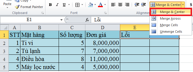 - Chọn Merge & Center và chọn 1 trong 4 tùy chọn sau: