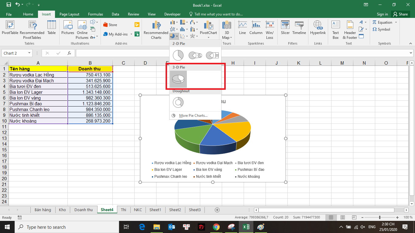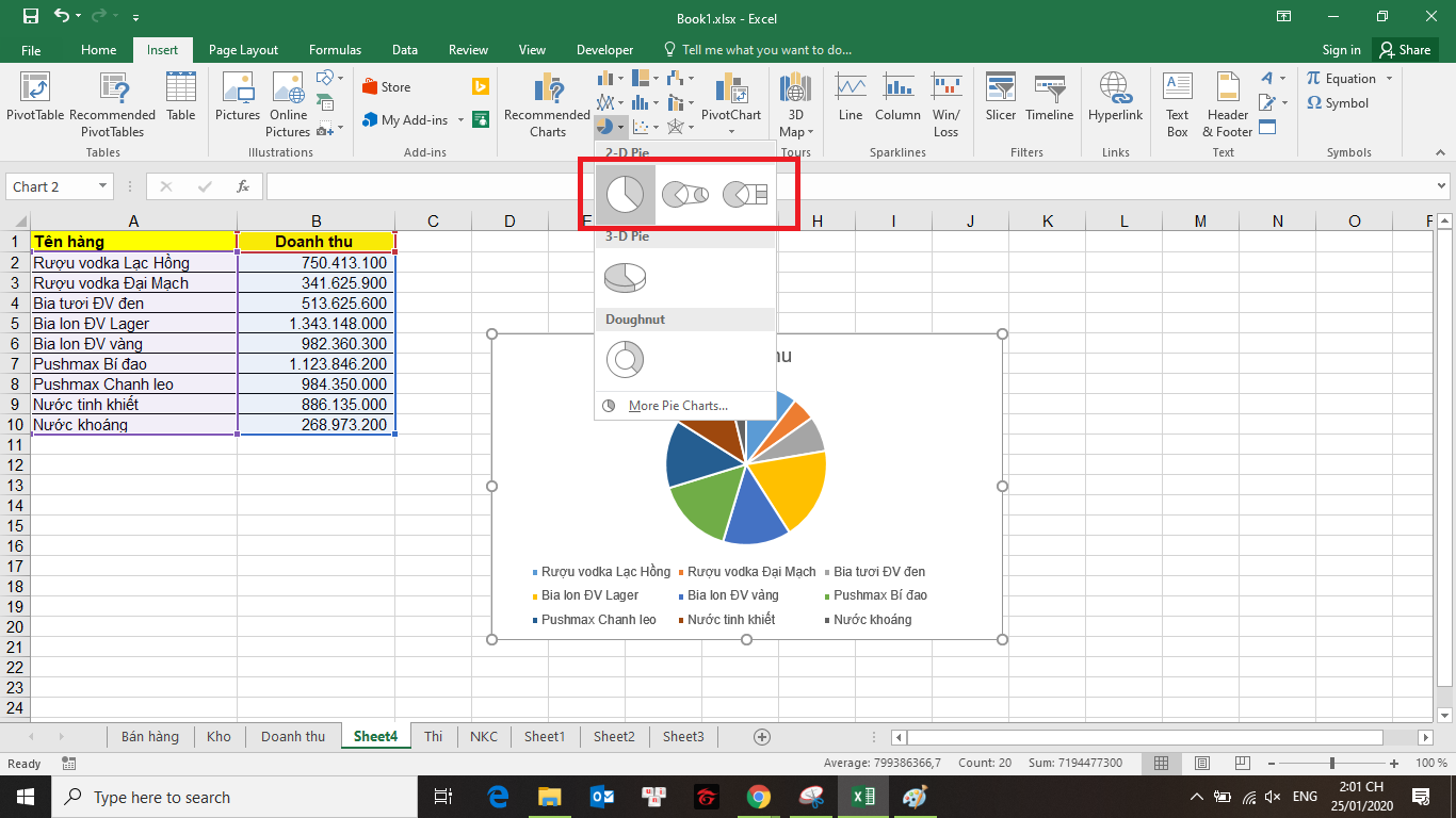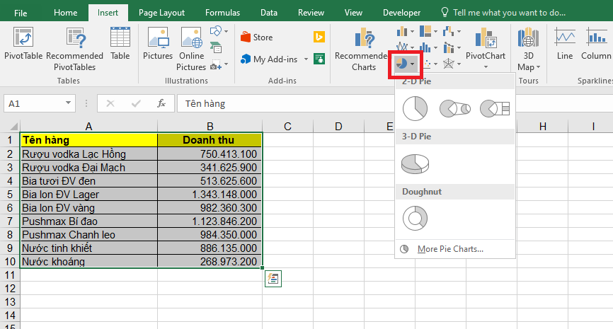 - Insert → Biểu tượng Pie → 2-D Pie.