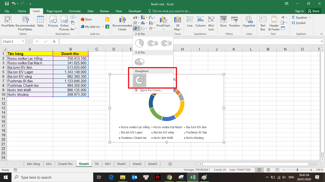 Nếu các bạn có nhiều hơn một loại dữ liệu mà các bạn vẫn muốn vẽ biểu đồ tròn thì các bạn có thể sử dụng biểu đồ Doughnut:
