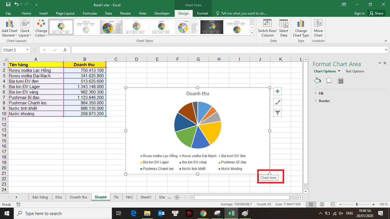 Ta muốn tạo biểu đồ tròn để thể hiện được tỷ trọng của doanh thu của các sản phẩm thì làm như sau: