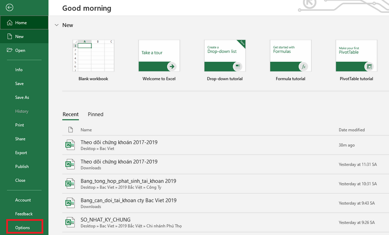 Bước 1: Mở Excel rồi chọn File =>chọn Options ở góc dưới bên trái.