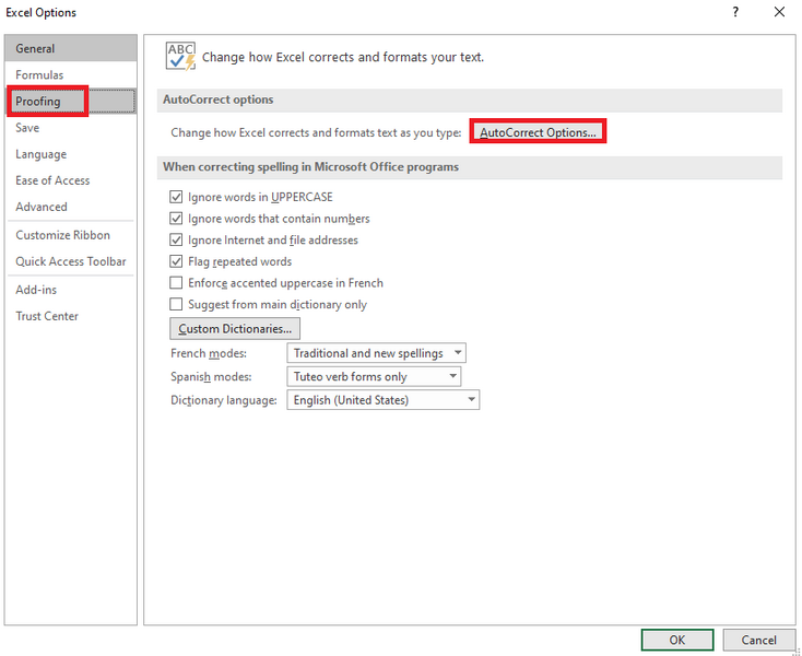Bước 2: Khi cửa sổ Excel Options hiện => chọn Proofing => chọn AutoCorrect Options…