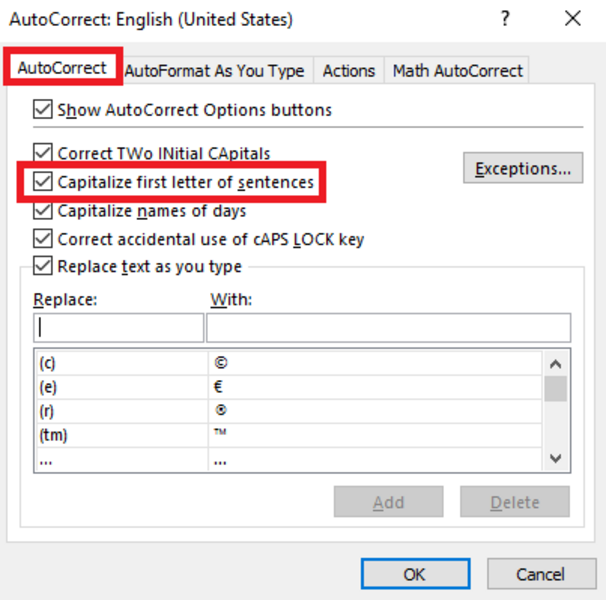 Bước 3: Tiếp theo chọn thẻ AutoCorrect => tích chọn vào mục Capitalize first letter of sentences => nhấn OK để hoàn tất cài đặt.