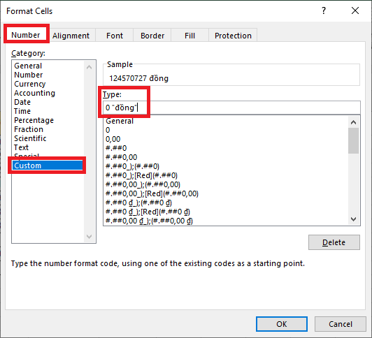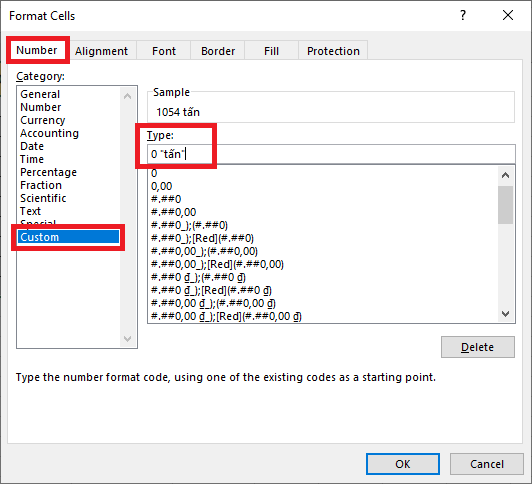 Number> chọnCustoms - Bước 4: Nhập định dạng sau tại ô “type”
