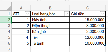Ví dụ ta có bảng dữ liệu dưới đây: