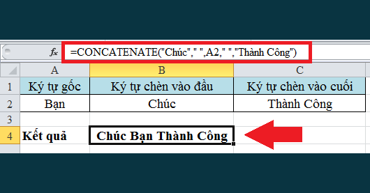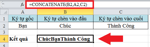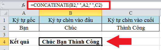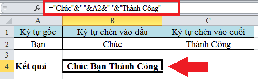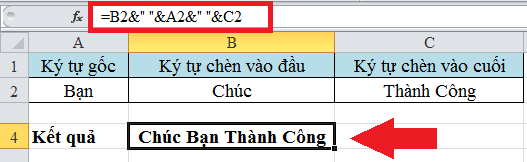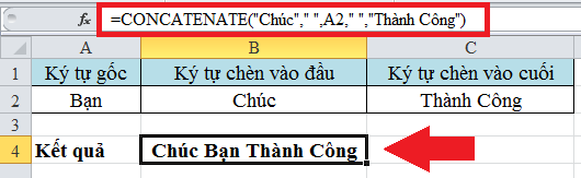 Quan sát ví dụ dưới đây để hiểu rõ hơn. Tại đây bạn cần chèn ký tự vào đầu và cuối của ký tự gốc. Khi hoàn thành bạn sẽ được một chuỗi hoàn chính là “Chúc Bạn Thành Công”. Áp dụng cú pháp như hình dưới đây bạn sẽ thực hiện được: